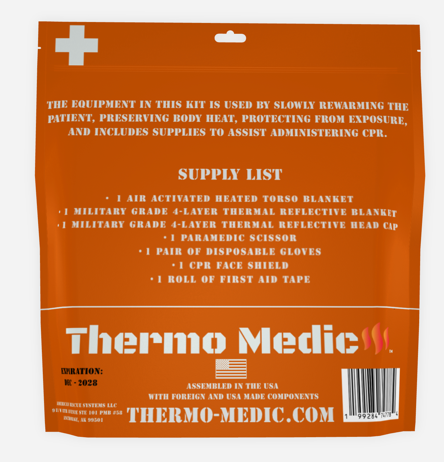 Featuring a military and hospital grade 4-layer thermal blanket and cap, this pack also includes an oxygen activated heated torso blanket in addition to CPR first responder gear assembled in a heatsealed waterproof bag.